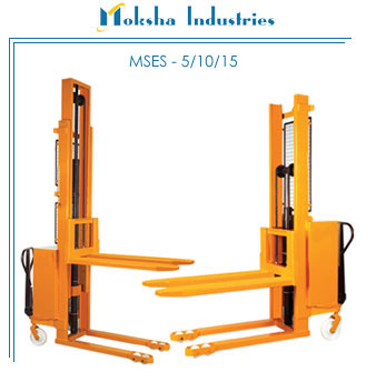 MSES 5 /10/15 are light manoeuvrable stackers with battery operated lifting function with a capacity from 500kg to 1500kg. MSES 5 /10/15 is extremely versatile, as loading and stacking takes place with the same machine. Further more this type of stacker can profitably be used as an adjustable worktable. This low-priced machine is a time saver and economical. MSES 5 /10/15 is versatile for industries and enterprises such as press shops etc. They are equipped with a low-noised hydraulic pump. Mast: The mast is made of quality steel and bent in C-profiles, together with the narrow cross-members that gives a light and very stable construction.The inner and outer masts are furnished with side thrust rollers preventing lateral play. Carriage and Forks: The carriage has an open centre section and low profile forks with inner reinforcements. The outside fork spread is as standard 560mm, but 480mm can also be supplied The standard fork length is 1150mm but 850mm can be supplied Hydraulic System : The battery operated lift pump is mounted on noise suppressing rubber blocks.The forks are lifted and lowered by means of an easily adjustable valve with built-in excess-pressure function preventing overload. All hydraulic hoses and fittings meet the SAE standard. The lowering speed of the forks is controlled by a lowering brake valve Special Version: Galvanized.